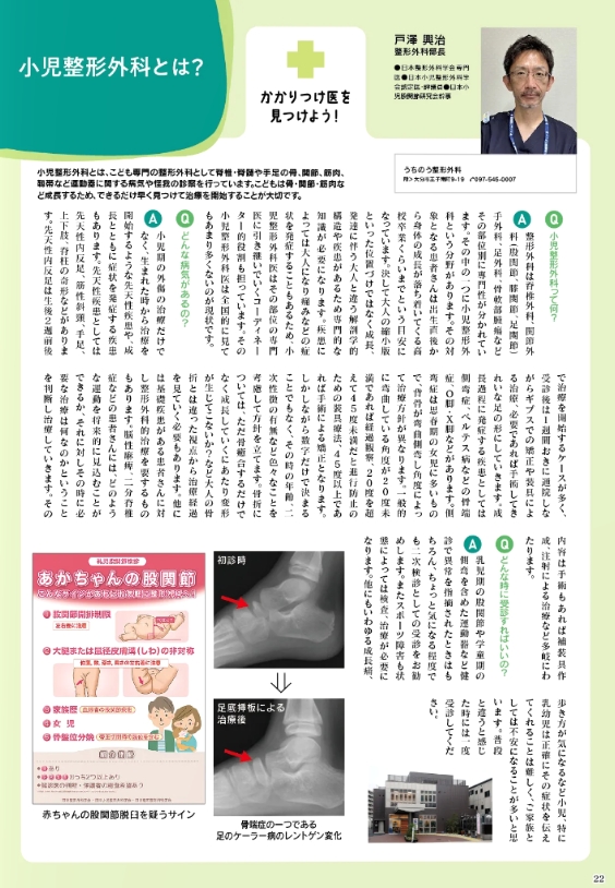 2025/3/24 「月刊ぷらざ4月号」へ戸澤医師の記事が掲載されます。 小児整形外科について、わかりやすい解説となっておりますので、お子さんのいらっしゃる家庭の方は、是非ご覧になって下さい。 デジタル版でもご覧いただけます!→月刊ぷらざ - 大分の情報満載-かかりつけ医を見つけよう! ![]() ![]() |